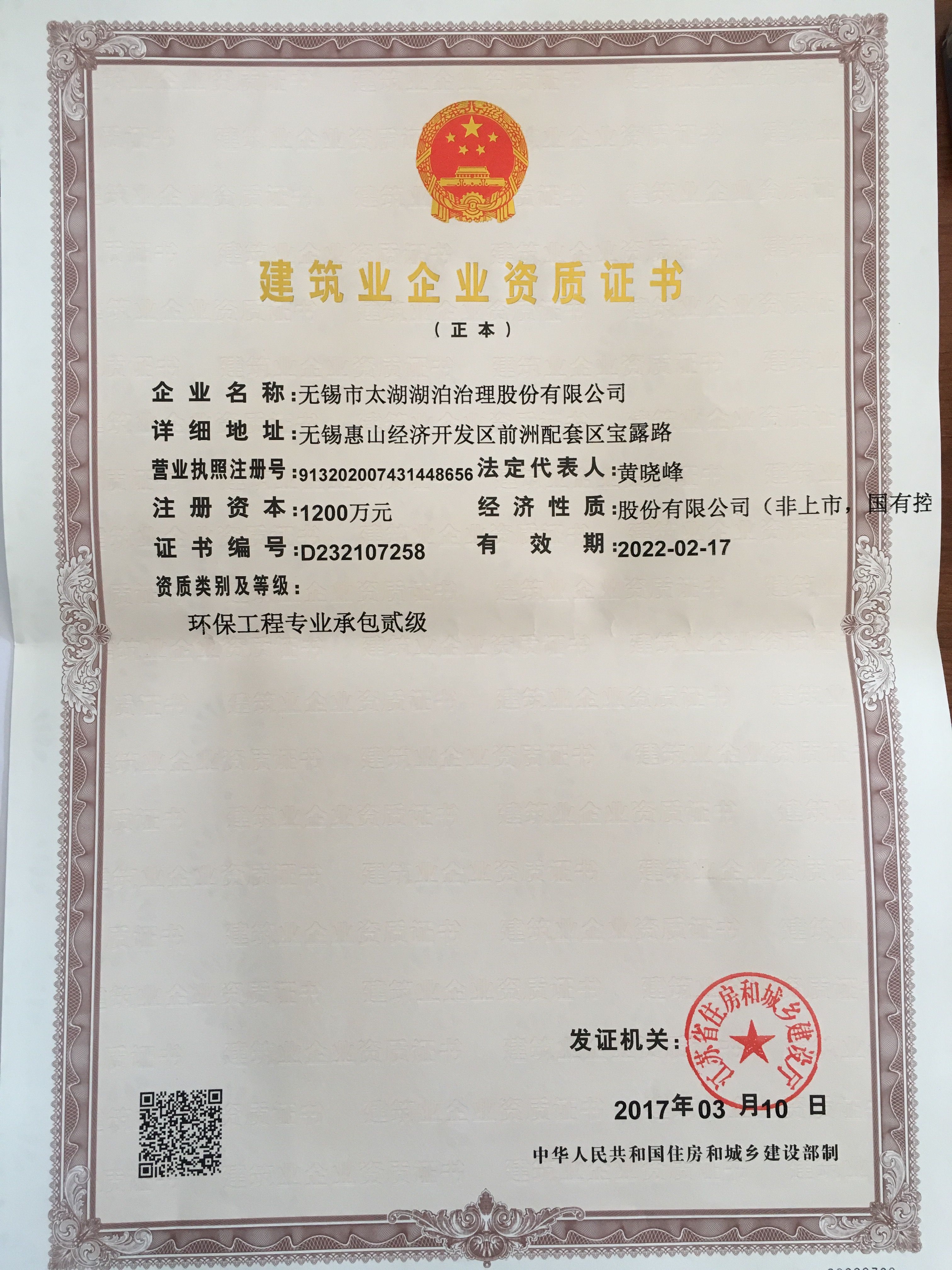 湖泊公司榮升環(huán)保工程專業(yè)承包貳級資質(zhì)