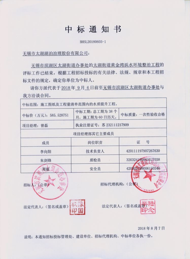 8月7日,無錫市太湖湖泊治理股份有限公司在太湖街道黃金灣浜水環(huán)境整治工程投標階段,憑借良好的市場信譽,成熟完善的投標方案,從眾多競爭對手中脫穎而出,成功中標該項目,中標價585萬元。